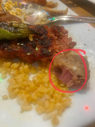 We were seated upstairs next to a large group by a very energetic waiter who was also serving that large group. At first we appreciated the service until we began to realise he was very manipulative, loud, embarrassing and over the top. I will get into detail why. We waited about 15 mins until he was ready to take our order. Baring in mind, he was the only waiter running around. We ordered 2x chicken platters with the rice. Unfortunately, majority of the chicken/kebab was raw! I took a bite, and had to get it back out again. My sister was sick after the food and threw up. I have provided an image for proof of the raw food. I was surprised myself as I figured there are other reviews with the same complaint about raw food being served here.