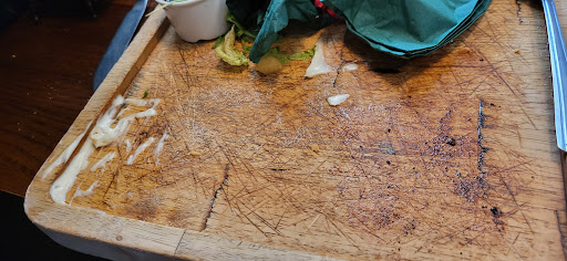 He finished his whole meal as it was edible, but the board it was served on was gross. So many previous knife marks, these boards harbour bacteria and there was a subtle stench of fish coming from the board.