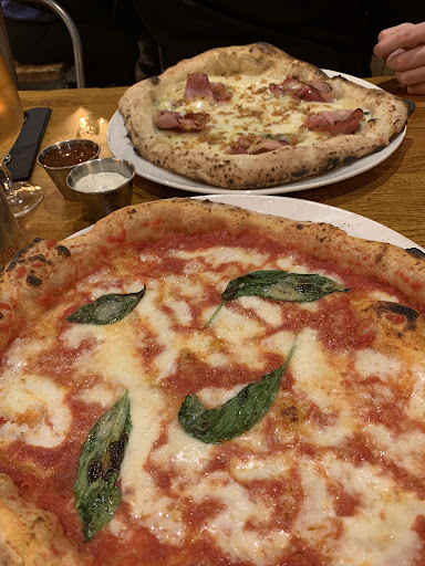 We've enjoyed Wood Fire Smoke pizza restaurant loads of times now and it ticks all the boxes. I would recommend booking as it gets very busy, especially at the weekend as the restaurant is relatively small. There is a recently added terrace on the wide pavement outside where you can people watch in good weather. The restaurant design is modern - shared long wooden benches and tables give an informal and cool industrial feel. The service is excellent - friendly, quick but relaxed. Now for the best part! The pizza dough is proved for 2 days and takes only 60 seconds to cook. The pizzas are the best I've EVER tasted. They use quality ingredients and the results are delicious and considering the number of times we've sampled them they are uniformly good - never a duff one. The dough is extremely tasty and chewy. The basil and Aioli dips are an extremely tasty accompaniment and are not manufactured "gloop" but great quality and fresh. The pizza prices are inexpensive and you can also take your own alcohol for for a small per person corkage fee.