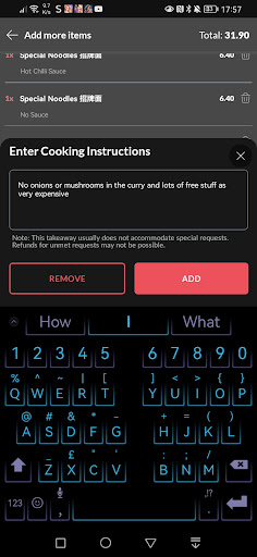 Read more£31.90 curry was runny sent 1 beef chow mein and 1 special when ordered 2 special chow mein only got 8 balls when was meant to be 9 was spoken to rudely on the phone also put mushrooms and onions in my curry when I said not to apparently it never came up but never had any of these issues anywhere else I have proof of what I ordered never using here again wouldn't recommend food...