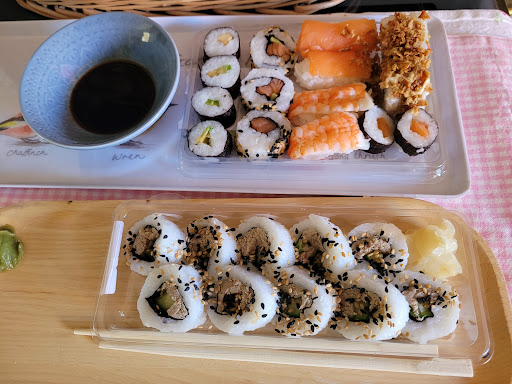 Japanese dishes taken from the belt or ordered from the open kitchen at a colourful chain eatery.