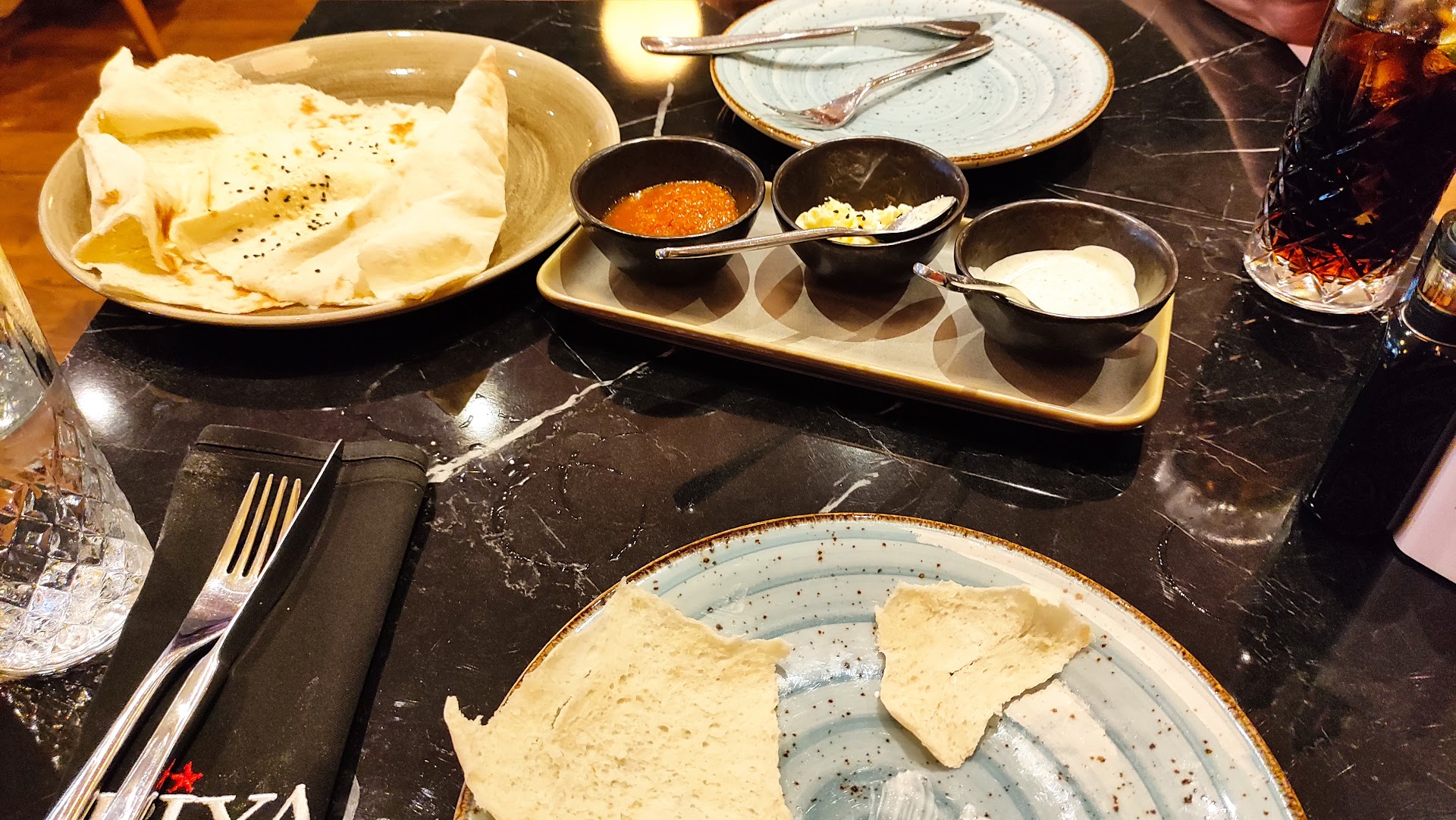 After ordering our Lamb Kleftiko, a complementary beautifully baked very thin pita (called puff bread) was brought to the table along with three dips which were all amazing. We were really impressed with this dish.