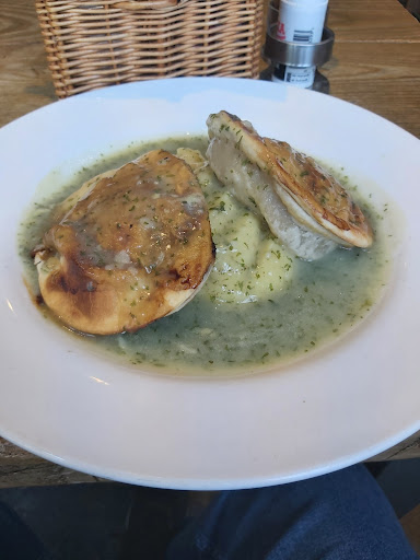 Cod was beautiful...but with overcooked (hence slightly bitter chips) and an incredibly light "smearing/cum-stain" of tartare sauce and mushy-peas, which is now being described as a "pea-puree"...I guess that's inflationary cost-cutting for you.