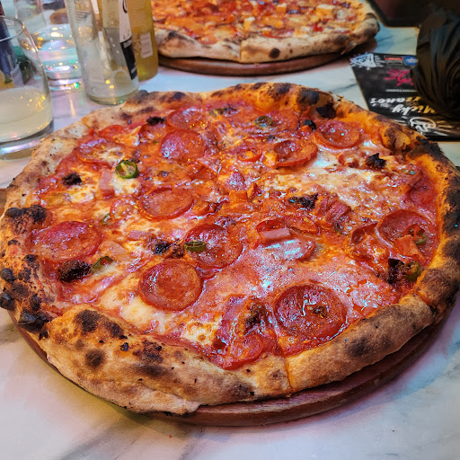 I booked a table here for a Saturday night thinking it was going to be busy, but the place was empty due to very bad weather. Anyways, we all decided to have just pizza, and I went for the Carne Piccante (spicy meat) option. It consisted of a margherita base with pepperoni, nduja, pancetta, and chillies. The pizza base itself was light, crunchy, and true to its 14" size...the toppings were plenty and of good quality...the chillies were lovely and hot! So be warned...if you don't cope with heat, don't order this pizza! My only issue was that there was a bit too much tomato base, which made the pizza sloppy. The mozzarella was fine. But overall, it is a good pizza and considering its larger size, and not bad value for money. So, why only 3 stars? We waited over 50 minutes for our pizzas, and we were the only people eating in! :( It takes 3 minutes to make and cook a pizza with a high temperature wood fired oven, so even with all the takeaway orders that they had coming in, they had to prioritise people in-house first and not make us wait all that time! They had more than one person making the pizzas, so they should just have done ours as soon as the order had come through. I find this sort of kitchen organisation unacceptable...I was close to getting up and leaving as we ordered the pizzas around 8.05pm and didn't get them until 8.52pm. At the end of the meal, the owner apologised for the delay, but I found it was a little bit too late for that. I think they need to be a bit more organised, especially if you have people who have booked and made the effort to visit and eat in your establishment. Hopefully, this review will help them sort out these slight priority issues they have. I would visit again as I did enjoy the pizza, and I do recommend it. Hopefully if I go there again their service will...
