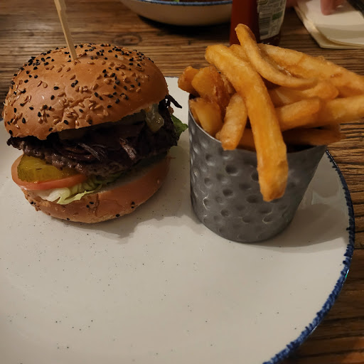Read moreI had recently started to go to this pub with friends just for drinks, but one evening we decided to get food too. I chose the Big Smoke Burger, which came with pulled pork, smoked cheddar, pickles, and fries on the side. The aged beef was moist, flavoursome, and not overcooked or dry, and along with the tasty marinated brisket, made a decent meaty combination. The cheese and pickles added more depth and flavour to complete the burger. The fries were crispy and had a nice coating around them. So overall, a good experience...but why the 4 stars then? Well, for £16.45 I just don't believe I was getting my money's worth...for what I paid there should have been more fries, instead of limiting them to that small cup they came in. Also, there should have been another side option included too...maybe a choice of coleslaw, onion rings, small corn on the cob, ecc. As you can see, the dish looks fairly small, and the plate is rather empty from the picture, so that is my only negative. The service is always friendly, relaxed, and professional...so if you're looking for decent grub and a warm atmosphere, then definitely check this place out! Dogs are...
