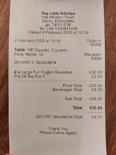 Read moreVery poor service. A request for a glass of water ( they only supply in bottles, took 12 minutes to arrive at the table. Unable to attract the attention of any member of staff. My bacon sandwich was burnt at the edges. Was not asked by the waitress how I wanted it cooked ! Paid the bill up front, no receipt offered to me. Upon leaving this poorly run establishment I was accused of leaving without paying my bill by a surly member of staff ,who clearly has no customer management training. One star rating is one star too many Zero star rating A reply to the poor service review was issued by Little Kitchen of a sarcastic nature, suggesting I dine at another café/tea room in future and recommending a quicker service of 3 minutes from McDonald's, which is of course not a Tea Room. The statement from LK is that I had mentioned there was a problem with the ice- No such comment has ever been made by me concerning ice cubes, this is pure friction ! Further I was not informed by the waitress that the bacon is burnt at the edges, deliberately . Why did the staff member not inquire how I wanted my bacon to be cooked in the first case. Also I find the food over priced which is why I would recommend a visit to this Tea Room as a plain bacon sandwich should not cost more than £ 4 maximum with this shocking poor service and cramped dinning room ( outside no better) Further I don't like being accused of not paying the bill, when I paid up front. Apparently the staff did their best on the busy Sunday. Good job I didn't attend when they were having...