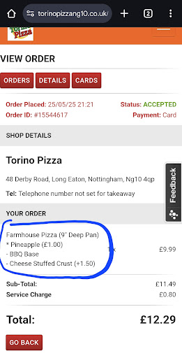 Read moreMade an order online for a "farmhouse pizza" which is listed as a plain pizza with the option of adding toppings. I selected pineapple and cheese stuffed crust as my only extras. Went to go and collect it and when i got home it had onions, mushrooms and ham on, as well as pineapple. So i called to say there has been a mistaken only to be told "no that's not right and I'm not lying" by the man on the phone. I said I'd check order receipt. I did and i was correct with zero mention of the other toppings. So i called again to tell them and i was rudely told "the farmhouse pizza comes with onions, ham and mushroom on". It absolutely 100% does not say ANYWHERE that it comes with anything on. Its literally the only listing which has no toppings on as standard.