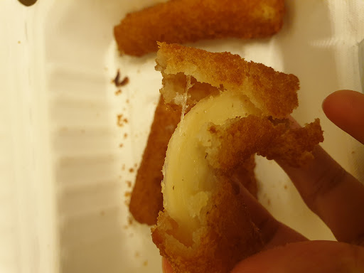 The staff in the shop insisted that the mozzarella sticks were their "new version" of halloumi which is smaller because they were losing money on the original size. The woman in the shop assured me it was definitely halloumi as she had cooked it herself. The item I had was 100% mozzarella (it was stretchy in texture and tasted exactly like mozzarella and nothing like halloumi). My partner checked too and agreed. It was also breaded instead of battered. See photo.