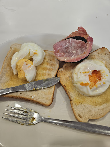 Came into the cafe and ordered on the self service all went nice and easy. Found a seat and cleaned the table from cutlery and dirt and sat down. Waited 16 minutes for the food which I do deem acceptable. Then the food came ..... 3 stone cold pieces of bacon 4 burnt luke warm sausages Freezing cold beans Fried bread that was more solid then the table. Egg was good as were the hash browns Wait whereâs my toast I paid ÂŁ1 for ? Letâs ask the waiter table cleaning guy. He replies oh u have fried bread. Iâm like yes that comes with it whereâs the toast. I have never seen someone so gormless. Eventually he goes to the kitchen comes back gets my receipt stares at it goes back to the kitchen comes back and says will be a few minutes. Well 3/4 of my breakfast later out comes 2 pieces of toast with solid unspreadable butter. Totally pointless now have to try and fight for the sundaes I foresee this as a disaster.