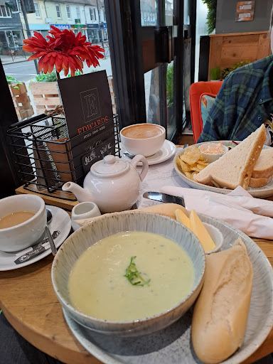 An absolutely amazing place, one to visit from near or far. My first time in Fareham and looking for a cafe to enjoy a warm drink my friend and I spotted Edwards. With a well presented and eye-catching exterior we looked closer to find that not only did this store front offer hot drinks and food, but also housed a hairdressers, this had to be seen to be believed. Stepping in we were greeted with an intelligently decorated interior, replete with hanging plants and colourful, comfortable furniture. To the rear of the store is the hairdressers, which looked popular and equally well presented. We made our way to the cafe counter and were warmly greeted by a member of staff who allowed us to peruse the menu and boards at our own pace, we then sat at a lovely little table by the window in two wonderfully comfortable lounge chairs. After an opportunity to look over the menu at our table the host came and took our order, also being happy to answer our questions about the stores unique dual purpose. The food was freshly prepared and presented to us upon gorgeous tableware. I had the soup of the day, one of two available, and was delighted with its flavour and quality. What had started as intrigue turned to a delightful visit, which I would recommend to all when in Fareham. Whether living locally or passing through Edwards Coffee lounge...