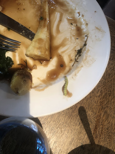 We’ve tried this pub one too many times, each with disappointment but after deciding to give it another try as a year had past, our party of 6 had the worst experience yet. The table was filthy and even when one of our party got them to wipe it down, we had to use our napkins to cover the table as it was still so sticky. The food arrived and my husband’s was inedible. He had ordered the kidneys and it arrived in a steak sized chunk, red raw. He sent it back and ordered a roast instead. I ordered what sounded like a nice salad and paid an additional £4 to add chicken. The salad was bland, the beetroot was brown instead of red, some items missing from it and as for the chicken, 4 pieces the size of a child’s thumb. Probably made up a third of a breast. But the worst was still to come as while one of our party was chewing through his cabbage from his roast, he found a cooked caterpillar. I don’t know if it was a blessing or a curse that he had already eaten most of his meal but I for one didn’t eat another bite after he hooked that out! We called the waitress who in all fairness was not the person who should be dealing with a complaint such as this, and she took it away to the kitchen. She then came back, apologised and said the manager will take it off the bill and offer an additional 15% off. The manager didn’t even bother to come out when my husband said that he was shocked that was all that was done! We didn’t want money off, we just didn’t want a terrible meal and caterpillar in the food! The manager should have come and spoken to us but obviously didn’t see it to be important. Needless to say, we will never, ever be eating in this...