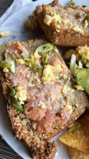 Really bad experience. We would never go back. The guy that took our order was pleasant and seemed efficient. We went in for coffee but seeing the menu, decided to eat as it looked really interesting. I ordered scrambled egg with spinach, Parmesan and chilli. I specifically asked what bread they had. I asked for granary. My wife had scrambled egg with spring onion and smoked salmon and specifically asked for wheaten bread. It arrived in 10 minutes and looked Ok, other than.. who has half a bag of Doritos on the plate with scrambled eggs on toast? It soon became apparent that weâd both got the right eggs, with each others bread selection. I went to the counter to tell the waitress. She came over and took them away. I said, âif you just want to switch them around, thatâs fine. Iâd have done it myself here but itâd be too messyâ. We then waited 15 minutes for the meals to come back. Now to be fair, theyâd been done again from scratch, correctly. Unfortunately, it was really nasty! Mine was OK, just very bland. If there was chilli in it, news to me! Under seasoned too. But, it was my wifeâs salmon that was the killer. As you can see from the picture, thatâs not like any smoked salmon Iâve ever had before! It was all smashed and nasty looking. My wife said it was like cat food spread on the toast! I didnât want the Doritos but my wife tried them because she couldnât eat her salmon. She immediately said âthese are soggyâ. We left most of our meals. I went up to pay and was told âwe donât take cardsâ. I looked a bit surprised and the woman said (obviously had this lots of times) âthere are signs up everywhere telling you thatâ. I looked and couldnât see any. Then I clocked it. A sign next to the till where you go to pay. I had no English money on me. She directed me to the cash machine over the road. I went and got money. On my way back in, I looked for the âwe donât take cardsâ signs. There were none. Not in the window, not on the door and not on the tables. one sign, by the till, that youâd see as you tried to pay. All in all a...
