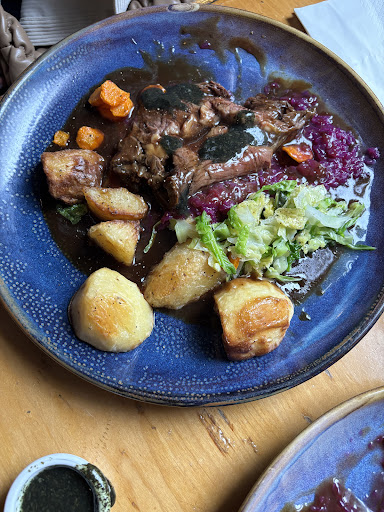 Read moreThe experience starts as you enter, there was a light shower but they have a waterfall feature which they have achieved by not maintaining the gutters for many years, this allows a torrent of water to pour down the front of the building. We were a party of three on 31/12/23 one was a lady of 95 who needs a wheeled frame to assist her walking, this meant I had to stand and endure the torrent while holding the door for her. Once in there is a fireplace which I assume should have a warm welcoming fire but I think the chimney has received as much maintenance as the gutters, itâs blocked and there is no updraft there was no flames just lots of smoke pouring out. Then the usherette came and showed us to our seats, or thatâs what it seemed like. It was like going into the cinema after the film has started, I strongly advise you to bring a torch. The service was acceptable or on the poor side of acceptable. We ordered the Sunday roast dinner the Yorkshire pud was stone cold the roast potatoes although cooked they were rock hard and took some cutting, the veg consisted of red and green cabbage and cauliflower which were cold the meat was good. The pain was not over, as we left we stopped to pay, which meant that just like the monkey in the little row boat we were throughly choked and soaked as we left. If I had to sum up the experience in one word it...