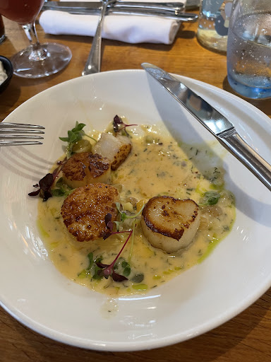 We visited this restaurant based on a recommendation from someone local to the area. Upon arrival we received a warm welcome and were shown to our table, the service was prompt and professional. My husband popped out to make a call and joined me shortly after, his welcome was slightly less welcoming, greeted with a questionably toned âhow can I help you?â, rather than a pleasant âHello/welcomeâ that is expected when you visiting an out of the way eatery. The Head waiter was attentive knowledgeable and extremely professional, he made food suggestions which we took as a result. I started with the scallops, my husband, the octopus, (as per recommendation) of the two starters - the scallops were exceptional!! Again, on recommendation, I opted the fish of the day, my husband and daughter had the fish & chips. The portions were huge, pricing appropriate, quality high and flavours well executed. An interesting point to note, I needed to visit FaceBook to view the menu before visiting due to the website not sharing it - a peculiar omission for this type of establishment. Would I go again? For the food - absolutely - I love my food to be of a high quality, and full of flavour - this certainly delivered on that.