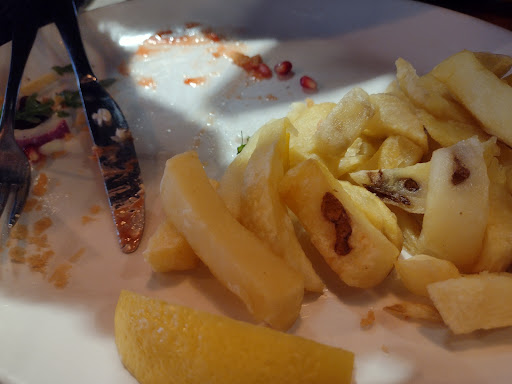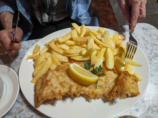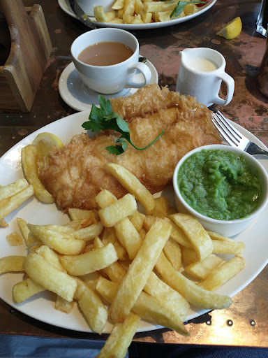 I have rated this 4 star as opposed to 5 on basis of misleading menu. We ordered cod and chips with mushy peas and haddock and chips, no mushy peas, and x2 pots of tea. Hardly any wait at all. The food arrived swifltly and beautifully presented but extremely weirdly, served with a humongous side salad! We did not ask for a salad and it was a large portion of salad which we both felt did not blend well with fish & chips ( not anti-salad generally) and we certainly would not have requested this and WAS NOT asked if we wanted half chips and half salad by the server. A larger portion of chips would have been preferable and it would have been nice if he had made it clear when ordering if we were compromising our chips portion for salad which in no world of mine does salad go with fish and chips! Also the salad had strawberries in it! Apparently according to external signage outside the restaurant, it states this restaurant is a WINNER 🏆 in some top notch food/dinning capacity. I do think the food is very acceptable but not outstanding by any means ( have tasted far better in North Shields for sure) but it was very tasty and welcome as we were hungry after a very busy gardening day and the food was very well presented. The two staff members serving that day were polite and efficient. I noticed it also serves alcohol so that is an interesting quirk to a fish & chip shop. Definitely better a pint with your fish & chips than a salad! Sadly we both had to drive that day so not an option. I would certainly visit again and order WITHOUT salad making it very clear to server because clearly its their policy to assume you want half salad and half chips. It has decent amount of parking on site. We used the bathroom too which was clean and good hand drier and nice soap and moisturiser available. It was not extortionate prices but not cheap. Usual expensive fish & chip prices,we have all been forced to accept,...