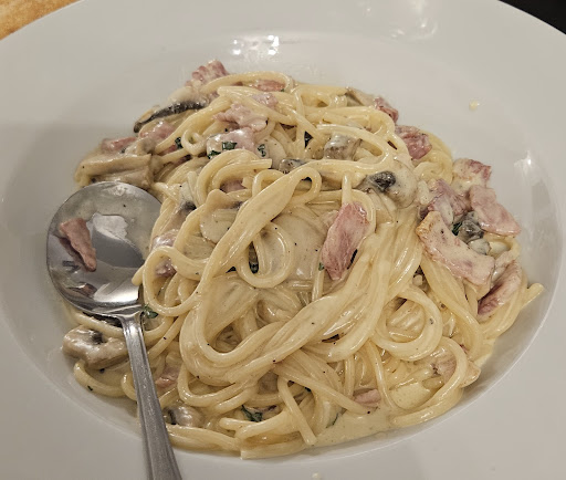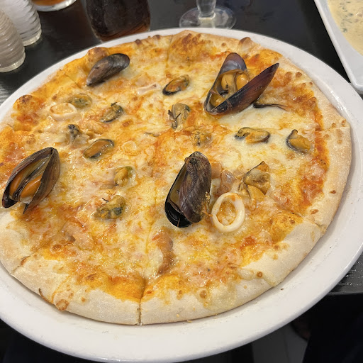 Read moreWe called on spec and were offered a seat at the table right beside door which I said i wasnt keen on, but was told I'd have to wait 10 minutes I felt this was a ploy to get us out of happy hour. However we sat in suggested seat. Incidently the whole seat along the wall was extremely uncomfortable and wobbled with other customers every move. Starter of black pudding and peppercorn sauce was distinctly average and i had the end of the roll of it. It could have done with some bacon too. Peppercorn sauce quite bland and had a skin over it. I purposely only had a little black pepper added in anticipation of the heat from the peppercorn sauce. But it wasn't so. Mozzarella starter again bland as was tomato sauce served with it. My carbonara was ok. The nicest flavour was the mushrooms. Clearly fresh and tasted delicious. Needed a lot of black pepper to enhance taste. My husbands la spada pizza base tasted undercooked for his personal taste and was better reheated the next day. Same issue with base of garlic bread. Quite an expensive evening for a early tea time meal. The wine was extremely expensive for a house white and was luke warm.