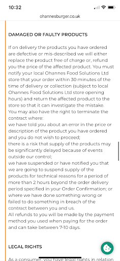 The terms and conditions say that if your food was mislabelled or incorrect you are entitled to a new order or a refund but this is not being honoured in the shop.