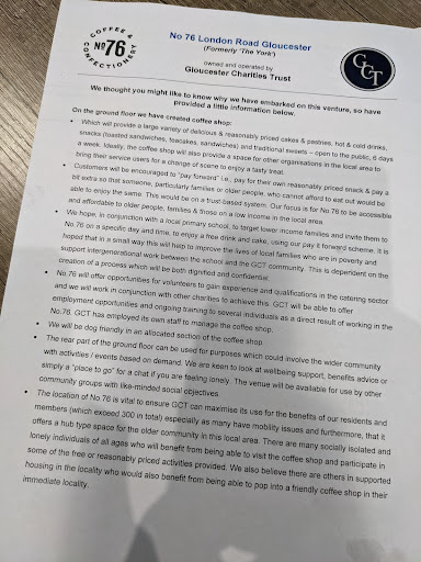 Charity trust Cafe 76 ive been going in on many occasion and i find the cafe is fantasic spotless and beautifully run The two staff what run it you could not ask for a better two people to run it Thier should be allowed to run that cafe how thier seem fit cause thier go out of thier way to help anyone in thier thier deserve all the recognition going for running that cafe. And when busy no extra staff to help charity trust should no better . If one person as a accident leaves one person on thier own should be at least 3 paid members of staff for security and health and safety at all times. These two staff are run off thier feet with no time to take a breathe before serving the next customer I find the charity trust do not give thier staff the recognition and care their fulley deserve shame on the charity trust . Scrooge got nothing on charity trust scrooge at least learnt how to treat his staff . And the two staff deserve a gold medal and a pay rise for all the hard work thier put in day in and all year out. Staff well done and thankyou for all...