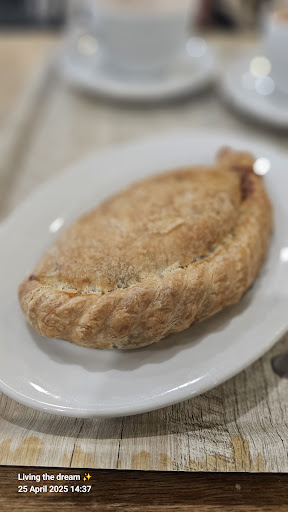 The staff were all working like crazy, trying to keep up with the demand. I had been going to order a pasty but when it came to my time to order, found myself ordering the goats cheese and chorizo Spanish omelette. I don't know what possessed me when the pies were clearly very fresh and looked so enticing, but it just felt more brunchy. I asked for it to be heated. I also ordered cappuccino and Portuguese custard tart.