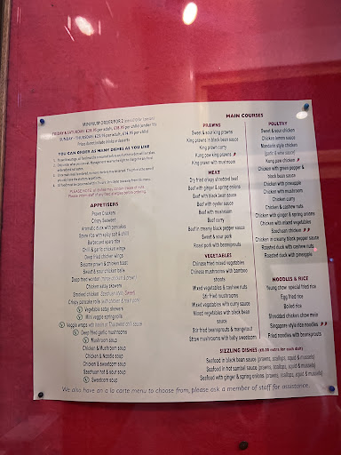 Read moreService is good. Buffet menu for a hefty £23.95 per person. By the time you have read the rules, your starving . Ordering starters first we were asked if the Chicken Sate` was for 6. We got one each. 1 sweet and sour chicken ball. 1 garlic mushroom cut in half. You get the idea. I ordered lemon chicken. Was shocked, when I complained, they bought me a fresh dish. Just 3 slices! 2 types of rose wine, £20 a bottle !! And one of those was Mateus Rose ! Decor in the restaurant hasn't changed for 30 years, same pictures, same wood paneling and same steamed up window, so it's impossible to see the view. Not value for money ,...