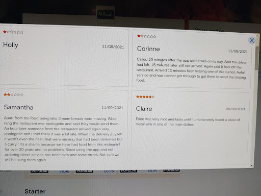 Read moreDo not attempt! Ordered for 6pm. By 6.30 still no food, called up and it took several attempts to even get them to answer the phone. Was told that the food would be delivered shortly and a hour later what turned up was vile food that was rotten and unfit to eat. After only a taste of the prawns the next day we both had food poisoning! To add to that, half the order was missing! No rice, no onion bhajiâs and no naans. Could get in contact with the restaurant for days after, leaving voicemails, emails, reviews just to be noticed. Finally got in touch with them only for them to say âhow do you know it was our foodâ shouting and yelling at the customer. When offered a replacement meal it was a complete joke, that meal for two cost nearly ÂŁ40 and instead of a nice evening we got abdominal pain, vomiting and a boast of other problems. On asking for a full refund we were initially accepted but then muted and put on hold while the aggressive manager clearly put a stop to this. Absolutely vile behaviour and I will be going to trading standards about the quality...