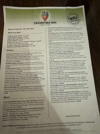 Ā Ā Ā Read moreThe Cricketers in Meopham is somewhere we've been many times before, and it offers a consistently good dining experience. We were a party of 5, having Sunday lunch as it was my son's 3rd birthday. The waitresses were attentive and professional, although I think 1 or 2 of them were quite new as they were very quiet and came across a little inexperienced, but that's fine they'll soon learn. We initially sat outside but there were quite a few wasps around so the waitresses kindly helped us move our stuff and plates inside. The food was fine, but perhaps not as good as previous visits. I chose the roast pork duo. It was meant to be pork shoulder and pork belly, but the belly was missing. It looked like they replaced it with a piece of pork stuffing, either that or they just forgot to put it on the plate altogether, but they didn't mention they'd run out and to be honest, I didn't ask. The portions were generous but everything could have done with a bit more seasoning. We had brownies and ice cream for dessert which was really good. The only other minor criticism I can have is that when I booked the table online it asked if I had any special requests. I asked if possible could they do something for my son's birthday but when we arrived there was nothing and they didn't mention it at all. It's only a slight criticism but would have been nice to receive a response or acknowledgement of the request, even if they couldn't fulfil it. To reiterate though, the staff were great, very friendly and well worth the service charge, the food was good enough and...