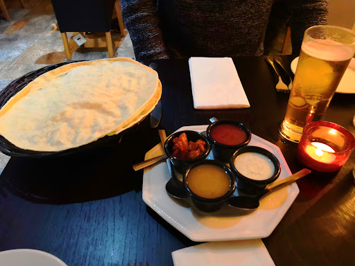 Read moreMy partner and I had a meal there today, we had poppadoms, starters, and a main each. At first I asked for water for the table but the glasses did not seem very clean, I had to ask for a new glass because mine had lipstick prints on it, unfortunately they don't have cobra on draft but the kingfisher they had was very nice. The poppadoms and pickle tray was nice, except a chunk of the poppadoms was missing and one part had a strand of hair cooked into the poppadom. We then had starters and they were very nice, the meat samosa was okay, the paneer roll was very tasty and the presentation was beautiful. The main was also nice - we had Chicken Balti and Kadai Chicken with rice, garlic naan and chips. The chips weren't the best and there were some chewy bits in both the chicken dishes, it seems like they use pieces of chicken thighs because there was a piece of chicken bone found in the Chicken Balti, although the taste of the sauce was lovely and the rice was very good. The service and environment was okay, and overall it is a bit expensive...