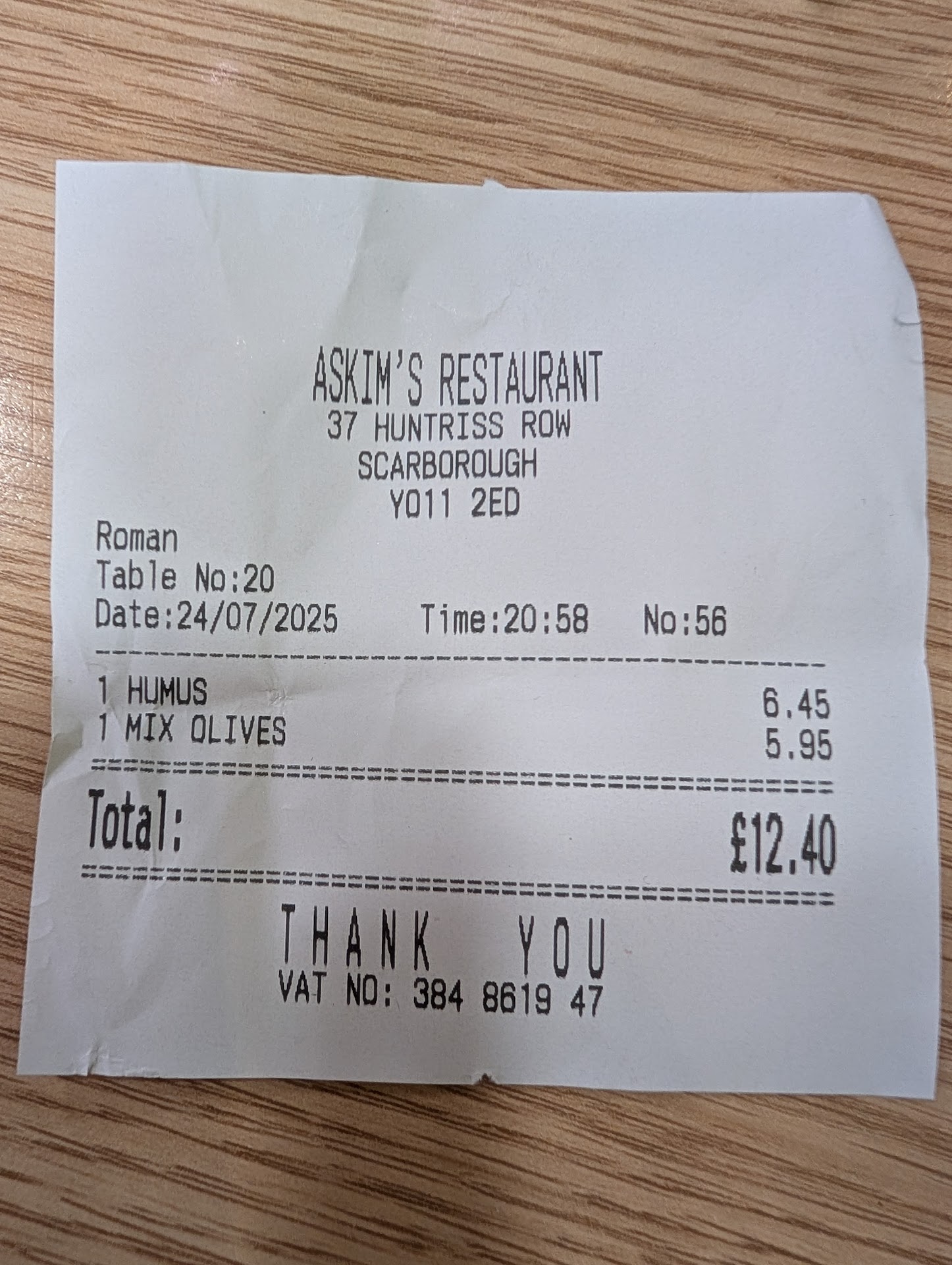 We ordered a cold starter (olives and hummus), which came straight from the fridge and was very small. We then waited over 45 minutes for our main dishes. Despite asking twice, the staff just said “OK” and did nothing. When we asked again, the waiter raised his voice and accused us of being rude, instead of simply apologising for the delay.