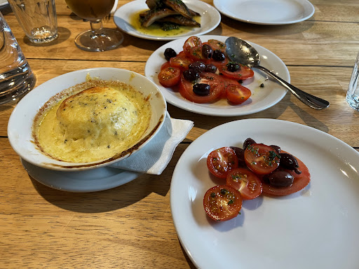 I ordered the tomato/olive salad, insisting that it could only be black olives and not green with pimiento, and the blue cheese soufflé. My husband ordered fish with capers. The food was presented fairly quickly. And we both did enjoy our meals He also enjoyed a Spanish beer. Not being a beer drinker, I cannot add any advice to that.