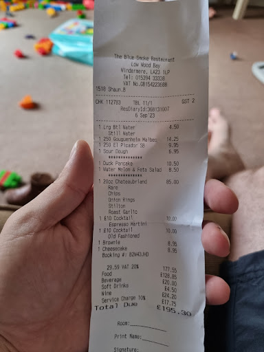 We visited Blue Smoke on the Bay on a Wednesday evening. It was not overly busy, but staff were busy attending to those already seated. We waited a couple of minutes for someone to confirm our reservation and were then seated. Here my first issue arose - the gentleman showing us to our seats was very abrupt and almost made is feel like we were an inconvenience to him. Not a great start, but a minor issue all the same. When we were seated, my partner immediately commented on her bench seat being fat too low. We decided to swap, so she could sit in the chair, and straight away I saw what she meant. Despite being incredibly comfy, the bench cushion sank to such a point that I (a 6"3 bloke) felt I was looking up at her, and the table was pretty much at chest height. It was comfortable to sit in, but not comfortable to eat at. The couple next to us commented on having the same problem and agreed it was not well thought through. The layout of the restaurant was pleasant, and we were able to see into the open kitchen where the three chefs operated and used the woodfire to cook the food. We were abruptly given menus by the bloke that seated us, before he whisked off to do something else. We then weren't seen again for another 10 minutes, which was ironic considering we wanted to order the Artisan breads from the "Whilst you decide" section of the menu. In the end, we ordered the bread at the same time we ordered everything else. Again, not great. Then the food started to come out, and things got better (to an extent). Starters: I ordered the Crispy Duck Pancake and my partner ordered the Watermelon, Cucumber and Feta salad. Both were well flavoured and portioned, with the duck being extra crispy on a bed of spring onions, hoisin sauce and one pancake. The salad was... Well, a salad. Main: 20oz Chateaubriand share platter, with sides of Onion Rings and Blue Smoke Seasoned Chips. Sauces: Blue Stilton sauce and Roast Garlic & Herby butter. The first thing I'll say for the chefs is this - that meat was cooked to perfection. It's hard to find an establishment nowadays that can actually cook meat rare and not have it go too far either way (usually closer to medium rare than rare). But this was spot on. However, if that cut was 20oz at any point in it's life, pre or post cook, then I'll be damned. For a 20oz chateaubriand, you should be getting more than 5 slices of meat. That really got my back up considering it was £85. The slices were not thick either. The sides were lovely, with the beer battered onion rings cooked really well, and the chips were well portioned. We then had the Brownie and Cheesecake for dessert. The options weren't great and were no more than you would expect from a standard British pub. It would have been nice to see a cheese board on there, given the prevalent nature of cheese in the local area. The desserts were nothing special - the brownie was packed full of taste, but the cheesecake was standard. When we finally asked for the bill, we were dismayed to see a £17.60 service charge added on - which given the poor service, we would have not chosen to pay - however being typical brits, we felt it would be rude to ask for it to be removed. So in total, our bill came to £195.30. Honestly, I can't say I would go back again. The food was nice, but that was about it. The service was poor, which for the prices you would think would not be the case. And until they learn what 20oz actually looks like, it's...