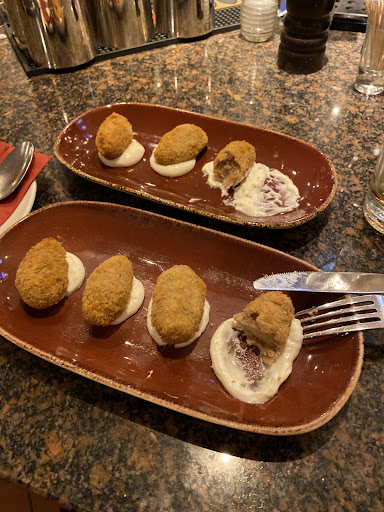 We ordered 3 tapas dishes and a desert each. Patatas bravas were good, in a rich tomato sauce. Padron peppers were bitter due to the black skin being left on after charring. Meatballs were overcooked, chicken breast was wildly overcooked and very dry. Prawns were obliterated as well... By this point you should be noticing a theme. They like to cook everything into oblivion. Croquettes were alright, despite being made in batches 3 days in advance (as per the other reviewer). Not great at all, but edible.
