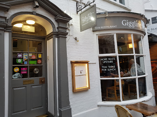 Went to the Brighton Giggling Squid for the first time, in a group of five on a Wednesday evening (booked a week in advance). It looks like a converted house. Two steep steps up to the entrance door, then sharp right to first dining area or straight ahead up and flights of stairs to other dining areas here and there. Toilets are right at the top of the building, in what looks like a loft conversion (low ceilings at 45 degrees). We had an upstairs table in a small side room containing tables for four, four, two and six (us). Wait staff were frequently to be seen and although it was busy (BOOK!) there was little hanging around. We ordered starters and mains in one go as we were very hungry, and eight drinks. Cocktails served quickly, all good. Food was presented in lidded fry pans and stoneware bowls, which you ate from with knived and forks. Everything was nice, one starter, one main and a rice or noodle dish was about about right size for one hungry adult. They add a 10% service charge to the bill without asking, but waiter said that is shared equally between the staff so I left it at that and no tip on top, £184.03 total. NB. Evening parking at The Lanes is just £5 from 6pm to midnight and we used it. It is an excellent facility just found the corner from...