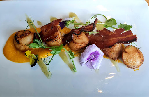 We went to Windermere on a short break to meet up with our family and had one evening spare. Checking the local eateries, spotted Hooked and decided to book a table for dinner. This was an excellent decision. Hooked is a small restaurant specialising in seafood and has around 20 covers. We were phoned a few minutes before our reserved time to say our table was ready. On arrival, we were seated, offered water while viewing the menu. We decided to have a couple of Lindesfarne oysters each while waiting for our starter. So fresh and tasted great. For starters, my partner went for scallops with pork belly. I chose the Squid ink ravioli filled with crab meat. Both starters were beautifully presented and tasted good. To me, scallops are scallops once you are eating dived catch. Very nicely cooked. The squid ink ravioli was simply in another league. I loved it. For mains, my partner went for the fish pie with a side of triple cooked chips. My choice was the pan fried hake with a peppercorn sauce, mashed potatoes, creamed sweetcorn, red onions. The fish pie was very well done and presented. The pan fried hake was a taste sensation. Peppercorn sauce with fish? It was a mild sauce and had a hint of dill oil flavouring it. The red onions were sweet and mildly pickled. The fish was cooked to perfection. Every mouthful was a delight. And all accompanied by a bottle of picpoul de pinet to compliment each mouthful. With the main out of the way, desert was nearly a sticky toffee pudding, but gave way for other homemade choices - pannacotta and raspberry cheesecake. Both were excellent. Throughout, the service was good and each course was delivered quickly after the previous course was finished. An hour and a half after arrival, we were on our way. For my palate, this restaurant is well worth making the effort toseek out. I want to go back soon. Would I change anything? Yes. I would have an extra oyster at the start to make three each. Same starter and main without hesitation. I did think the sticky toffee pudding was probably the better desert for me. And my partner, she would have exactly what I ordered this time, with the delicate pannacotta to finish. A well deserved 5...