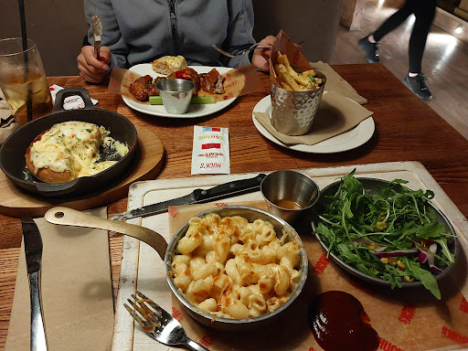 As a group of 12 we were on a long table - which was the case everywhere we'd eaten throughout our Center Parcs holiday - but it was impossible here to talk to anyone at the other end as it was so loud. We were offered either table service or use of a QR code on the menu. I'd have been happy to do the latter but most were more comfortable with table service and it was really very good overall considering the ground the staff were covering. Our drinks orders were taken and delivered promptly as were starters. The nachos are a great and sizeable starter - I'd happily have them as a main. Garlic bread went down really well with our 7 year old!