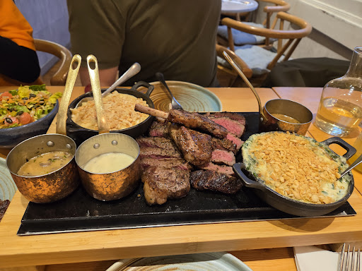 We cook steaks at home all the time so we know how long it takes to cook. ... not an hour! We didn't complain as we weren't in a rush but was mindful the children were starting to get fidgety! When the food arrived we tucked in eagerly and savoured every mouthful. We had a sharing platter (which included bavette, sirloin and lamb chops) with an extra rib eye steak, a salad and 2 macaroni cheese.