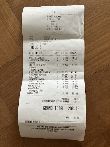 The quality of the food is not up for debate, it really is lovely, the problem we have with the place is how much they are charging for it, £20-£25 for most main courses is a lot of money for some chicken and rice, £14 for poppadums for 4 ppl but most shocking of all was the £9 for a bottle of Cobra larger! a drink you can buy in Tescos for £2.70 but this is par for the course in Windsor nowadays where we are being hammered everywhere we go for drinks and food, its crazy how expensive everywhere is becoming, they are cutting their own throats because ppl cannot afford to go out to those places any more hence why Weatherspoons is rammed every night because their drinks are cheap in comparison to most of these places, a few years ago you couldnt get into the Mango lounge at the weekend it was always full, the place was half empty last night, I doubt we will be going back anytime soon, not because of the food, sadly because of how much they are charging for it! and to rub salt in the wounds they stick a 10% service charge on the bill and put it in tiny writing that they have added a discretionary service charge, thats wrong! the "GRAND TOTAL" should be before any tips or service charge is added, its very deceptive because it looks like thats what you have to pay when in fact 10% has been added, its wrong and something should be...