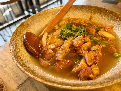 Read moreTuesday evening (28 may 2024) and the place was full, it looked great and there was a pleasant vibe... We drank a lovely house white Cabernet Sauvignon whilst we studied the menu and tried to ignore the incredibly sticky table. First of all, the pork belly was delicious, albeit rather anaemic looking but complimented very well by itâs hoisin sauce. Second to arrive, was salt and pepper squid which was rubbery and tasteless. I couldnât detect any salt or pepper. I ate one of six pieces, my dining partner managed a couple more of his. My partners dish of hot and spicy beef brisket soup with vermicelli was indescribably disgusting. It looked great but was bland, lacked salt and any hint of chilli. My partner thought the beef might be off, I didnât agree with him but it certainly had the strangest flavour...i donât even think a good dollop of MSG would have revived it. My dining partner did something I have never seen him do before. He sent it back. The pork gyoza sat before us looking pale and unappetizing. Looking like the innards of a dalak- perhaps itâs brain. By now, Iâm feeling a bit wary and ever so slightly nauseated. I look around at my fellow diners tucking into plates piled high with glistening food- all looking so much more delicious than the pale, fatty, rubbery, tasteless inedibles we had been so unfortunate to order. In a corner of the restaurant a babyâs piercing screams cut through the noise of people eating and all I could see was gluttony. Apocalypse now. The...