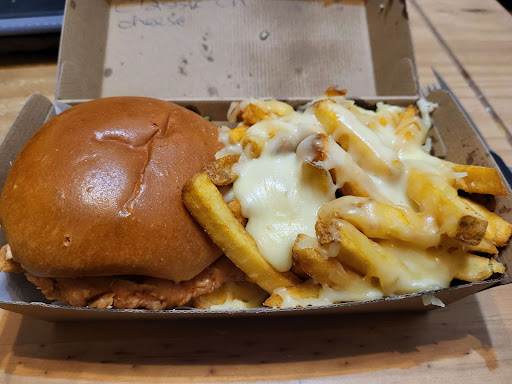 I had the fully loaded burger with a side of dirty fries, while my wife had the clucking classic (chicken burger) with a side of cheesy chips. Everything was delicious. Like Five Guys, it's a bit on the pricy side. We paid around £29 for our meals, but it's worth it compared to other things in the area. It's takeout-only, as there's just a counter and a few window...