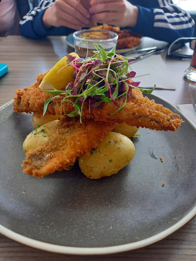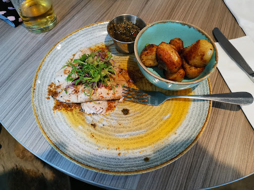 We had the chowder starter (a big fat Yes from me) and the muscles starter (even better than the chowder!), both came with a lot of bread. For mains we had lemon sole with coriander lime & chilli butter, dressed salad, and an extra white wine sauce. The butter was mild, but almost perfectly complemented the sole. The side salad was excellently balanced & very nicely dressed. The sauce was amazing. Both fish were cooked perfectly. I had mackerel fillet with cajun butter, a side of duck fat potatoes, and a chimichurri sauce. The cajun/mackerel combo was ❤️, the potatoes tasted super scrumptious, the chimichurri was excellent too. My only possible comment for improvement is that the potatoes could have been crisper, but they were skin on new potatoes so that's difficult. I wish I'd taken a crust or asked for the mackerel battered to give more texture, but that's down...