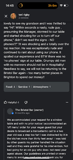 I dont usually post reviews but on this occasion, i feel I have to warn anyone looking to visit the Bristol bar. My wife and I experienced an unfortunate situation of passive agressive behaviour from the owner on valentines day. We decided to stop by as we had some emails to answer and fancied a drink whilst doing so. We've been to the bar on various occasions at different points in the day (receiving good service from the young staff members) and had been informed on a previous visit (by the owner) that he prefers laptop use to be in a separate room of the bar (which is not a problem) It is important to note that it is a side room behind the kitchen that is not furnished to the standard of the main bar. I left my card behind the bar as I didn't know how long we were staying and if we would be having more drinks and possibly a snack. The head chef served me and we made polite conversation. We had our drinks, checked our emails which unfortunately took longer than anticipated. We were there for about 30 minutes when the owner came to check the room. He left without a smile or a hello. Another 30 minutes later he came back to ask if we were having any more drinks, to which I answered that we weren't sure (as we were thinking about leaving) He proceeded to tell us that we needed to buy something as we "couldn't sit there all day", "we're not an office you know" and "I'm spending more money heating this room than you're spending on drinks". His tone was quite rude. I went to the bar to retrieve my card and pay where, the owner was in pleasant conversation with a few customers whilst pouring their drinks. Once he finished, he asked me what i would like and I responded that I would like my card back so as to pay and leave. I said to him that "I was surprised how he came at my wife and I especially as we have been frequent customers (we even chose to have dinner for our anniversary there last year). Unfortunately, I didn't get to finish my sentence as he immediately started talking over me. When I said "excuse me, I'm talking" he became furious, raising his voice loud enough for other customers to notice. "how dare you!" "I will not be spoken to like that!" "How rude!" I was merely trying to finish my sentence. The head chef (as its an open kitchen) overheard and kindly tried to calm him down. The owner gave me the drinks on the house, but that was mainly due to being unable to tap my card to get me out of the building quickly. We were astonished at the rudeness, lack of manners and lack of tact he displayed. Especially as we were the only customers in the back room for the entirety of our visit. If we were taking up needed space, that might have explained his demeanor. But for two regular customers being no trouble whatsoever it makes no sense. I've read a previous review that accused him of racism. I'm reluctant to make the same judgement, but it does make it difficult when I have been treated differently from other customers every time that have seen or been served by him. The fact that we've returned is due to the service received from the staff. We've found them to be chatty, respectful and attentive. We understand that it's his business, and he can run it anyway he wishes. However, manners cost nothing. We have always been polite and respectful when visiting. When you read his response, I'd like you to notice how the owner will refuse to take responsibility for his behaviour (which included raising his voice aggressively at me in front of other patrons) and insinuate that my recollection is incorrect. It isn't. His next option will be to suggest that I only post negative reviews. As i mentioned at the start of this review, I don't usually post reviews at all. Next he'll type out a backhanded apology dripping in sarcasm. Save it. Start treating people how you yourself would like to be treated (especially when you know they are...