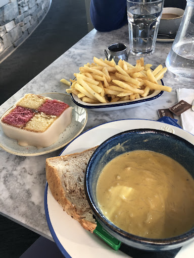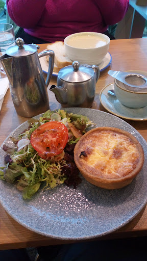 It's busy on a Saturday but the gave us a buzzer for a 20minute wait. The staff are very efficient and the food comes quickly. There are screens between tables and tables are wiped down between customers. It is upstairs but there is a small lift. The food was delicious and I had a Guiche Lorraine and my wife had Cauliflower Cheeses soup which looked very creamy, with white bloomer bread. My earl grey came with a tea strainer, and extra hot water. Something you usually have to ask for. My wife was offered a free glass of tap water. The service is very good and the food tasty. The salad came with a balsamic style dressing. We would come here today. There is a view but on a day like today not so good. We...