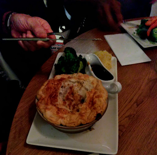 We were shown to our table and the waiter took our orders. The food was lovely. I had the pie of the day (a proper pie by the way) and my wife had the chicken skewer and rice. I had a mini pudding (great idea) which was a small portion of Bakewell tart and custard and a cappuccino.