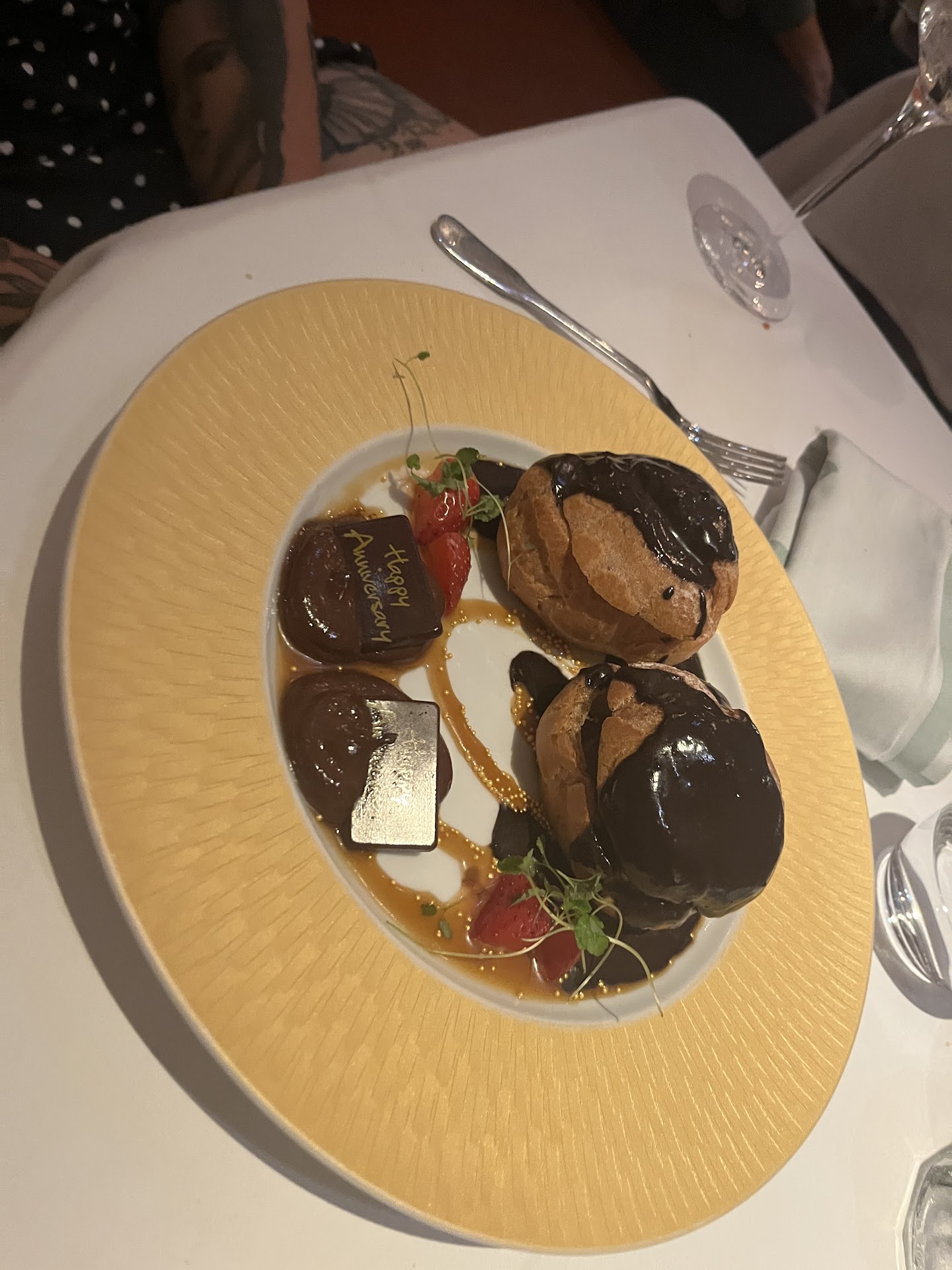 Staff were attentive, friendly and informative in a manner that felt genuine. Experience fuelled by good chat and exceptional service. What’s more is that, just prior to paying the bill, they dropped off a free plate of profiteroles and chocolate sauce for our anniversary. A lovely touch.