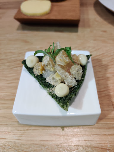 The first dish is oyster emulsion with crumbs and caviar which is ok nothing to shout after long wait between each serving. Next is mackerel, 3 pieces of lightly smoked mackerel fish with a slice of cucumber and 3 different drops of sauces. Slicing of the fish is in block hence not delicate in presentation as well as tasting of the fish which is not evenly smoked. A little bit disappointed with that. Next is Krabi- a dish to bring the taste of famous island in Thailand. Itās made of minced crab meat, curry, mango purĆ©e and topped with sweet nutty crumbs in combination brings very strong flavors to this dish. Again another 30 minutes wait before we get to the main or last dish called monk fish - served in emulsion, grilled artichokes, little gems as bed for mussels and potato shoe string fries? The dish is very bland for monk fish texture, emulsion again and doesnāt go in flavor with artichokes and mussels. To be honest, I donāt know what is the flavor x seafood the chef is trying to deliver here?