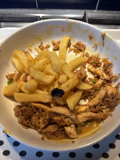 I had the chicken fried rice, curry sauce and chips. With mini spring rolls. I couldnāt taste a thing. Food was hot enough, fried rice was really dark and lacked flavour chicken was dry. Chips werenāt crisp and can almost guarantee the chips were a day old. Spring rolls were ok but not the best. Prawn crackers were alright though š.
