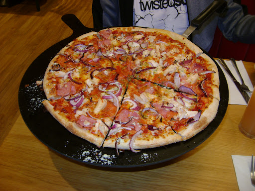 If that isn't appalling enough I went here with a few friends last night and it was the worst experience I have ever had. Food all over the floor, cobwebs everywhere, the seating was filthy and so were the toilets. To top this off we were told upon entering despite booking there would be a 20 minute delay on cooking the pizza. Fine. But after 15 minutes we were not served despite staff standing around doing absolutely nothing, and had to ask to be served. There was then a horrific wait for the worst pizza I have experienced. At this point one of my friends was offput by the awful state of the place and did not want to eat, the BBQ chicken wings we ordered were actually spicy and the pizzas were dry. My friend ate 2 slices of hers, and my girlfriend 2 slices of hers, and although I did finish my own was left with an upset stomach after. I will also add that the usually excellent salad was disgusting and felt like it had been left around a while or something.