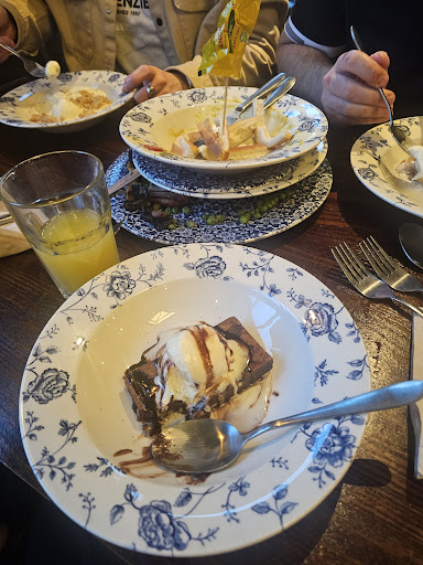 We went up to order desserts to be told only one was free so ordered apple crumble as free then on app order two other puddings. Well what can I say these turned up the apple crumbles were cold and one looked like it was baby food way dished up, and we was left to eat it with dirty plates on the table.
