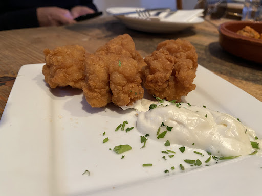 Food This is where this restaurant falls to its knees. We ordered 9 dishes between the 4 of us and a couple of starters. The "spanish crisps" were literally Walkers Ready Salted crisps on a plate. The chorizo was average at best, althought its a difficult dish to make badly. The "special" pulpo was overcooked and tasteless and the scallops were simply awful. In short, avoid sea food! In fairness, the spanish omelette was more than satisfactory and the artichoke salad and croquettes were pleasant.
