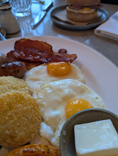 I chose it for the Vegan Pancakes and the portion was TINY!! 3 very small, very thin pancakes with (originally honey - which isn’t vegan/plant based) but swapped for maple syrup & 10 or so blueberries. It was disappointing. It also came 15 minutes after everyone else’s, after a reminder! (Again, really great service as this was sorted quickly) The Vegan Breakfast could do with some extras, e.g. scrambled tofu and vegan bacon to make it the equivalent of the normal full English. As this was also small. Unfortunately the normal breakfasts were quite undercooked, the sausages looked uncooked and the rostis were soggy.