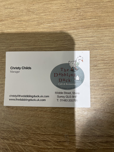 Read moreAs a 'local' I have eaten here many times. Today we had the worst experience. We (3 adults one toddler) were told we couldn't come in because my 3 yr old son was still eating a £1 ice cream cone purchased at Shere delights across the road (those of you visiting Shere that don't know Shere delights do visit, it's a wonderful sweet shop that even if you are just popping in for a quarter of pick and mix are always wonderfully friendly and great with the children). When we questioned it, the manager said 'you wouldn't take beer into a pub'. Well no but 1) DDuckdon't sell ice cream cones 2) I have and do sometimes take a drinking bottle of juice for our son in to all our local pubs and not one has ever refused me entry and 3) if they are that obsessed with extracting ever last penny from a customer that they would want to remove the ice cream from a toddler so his mother would have to buy him something else from them they are no longer my sort of cafe. Sadly dabbling ducks success seems to have gone to its head. Rather like the used to be superb Tillings cafe on the A25 that also got greedy (and rude) and now no one goes. We went round the corner to ye old sandwich shop, not the best name I know, but wow!!!! What a fab welcome. When we asked if it was okay to have ice cream cone the manager there said Im offended by the idea with a huge smile and then why on earth would I mind?. Found us a fab table. Served the most generous portions of scrummy coffee cake and in a quiet moment even played cars with my son from a box of toys in the corner. My advice: Pass by the dabbling duck and head to the sandwich shop round the corner opposite the Shere Shop. Lovely atmosphere and an attitude that deserves...